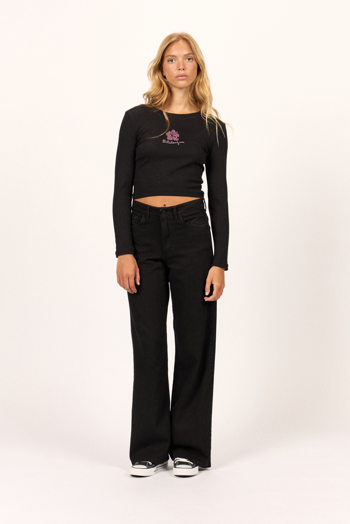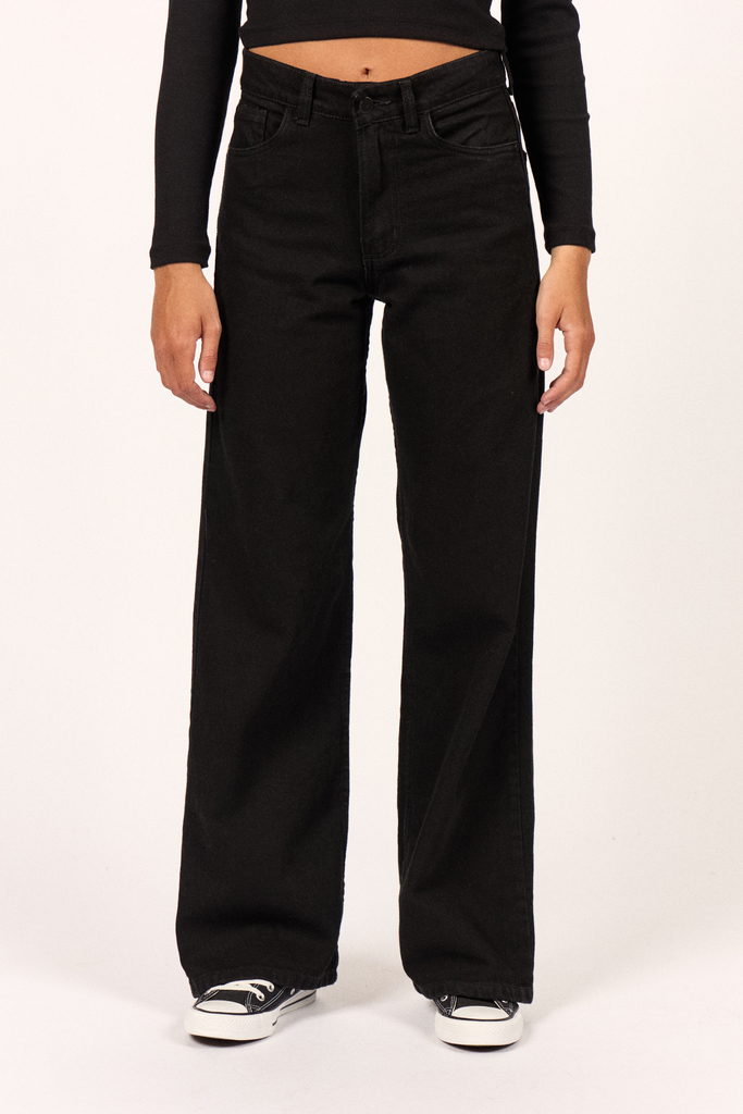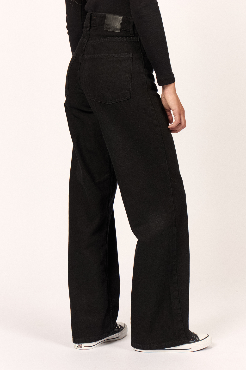 Jean Free Wide Black negro wide tiro alto, 5 bosillos, ruedo común. Badana de ecocuero color negro y avios metálicos en black niquel.